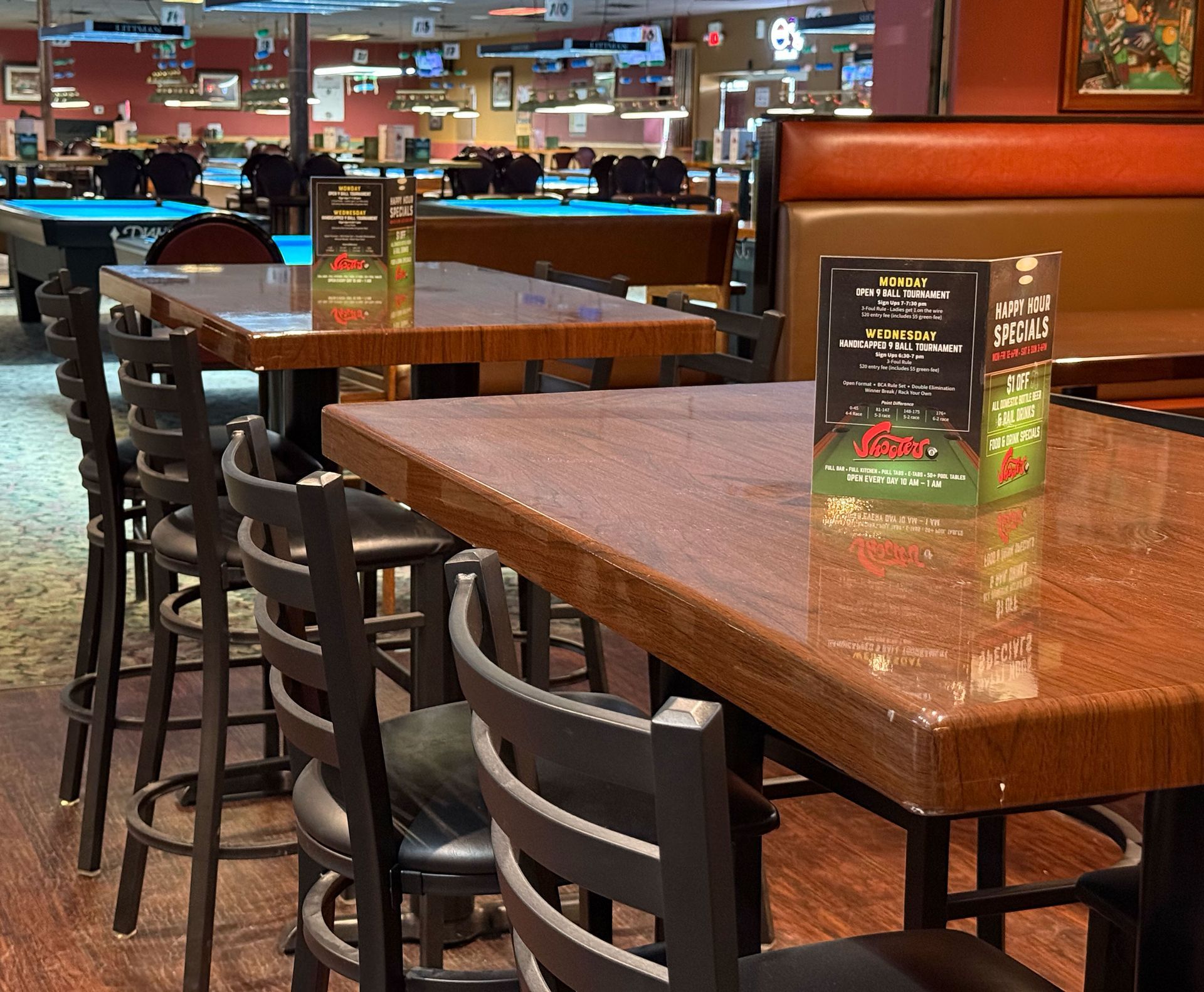 The new and improved Massé Cafe is located inside Shooters Billiard Club, the Midwest’s largest pool room in Burnsville Minnesota. Open from 10:00am to 10:30 PM, seven days a week, the Massé Cafe features everything from bite-sized appetizers and gourmet burgers and pizza, to homemade soups and sauces.The Massé Cafe helps to make Shooters Billiard Club the perfect place to host your special events such as corporate outings and birthday parties and Corporate Team building events. We have an array of special activities to offer your group to make it fun. We offer catering for up to 100 people, with a wide selection of Food and Beverage options for you to choose from. You can contact the food and beverage manager for any questions or special needs that your party may have. You can view our complete menu from the link below. And don’t forget, our entire menu is available for take-out orders as well. There’s more to the Massé Cafe than you may expect, so bring your appetite!